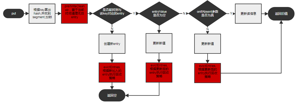 ReferenceEntry e;     Object entryKey;     for(e = first; e != null; e = e.getNext()) {         entryKey = e.getKey();         if(e.getHash() == hash && entryKey != null && this.map.keyEquivalence.equivalent(key, entryKey)) {             LocalCache.ValueReference<K, V> valueReference = e.getValueReference();             V entryValue = valueReference.get();             Object var15;             if(entryValue != null) {                 if(onlyIfAbsent) {                                           this.recordLockedRead(e, now);                     var15 = entryValue;                     return var15;                 }                                  ++this.modCount;                                  this.enqueueNotification(key, hash, entryValue, valueReference.getWeight(), RemovalCause.REPLACED);                                  this.setValue(e, key, value, now);                                  this.evictEntries(e);                 var15 = entryValue;                 return var15;             }                          ++this.modCount;             if(valueReference.isActive()) {                                  this.enqueueNotification(key, hash, entryValue, valueReference.getWeight(), RemovalCause.COLLECTED);                                  this.setValue(e, key, value, now);                 newCount = this.count;             } else {                                  this.setValue(e, key, value, now);                 newCount = this.count + 1;             }