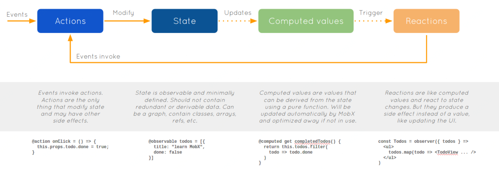 Reactions(反应):反应指状态变更时需要自动发生的副作用,这种情况下,我们需要实现其读写操作;